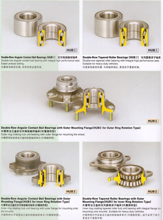 Wheel bearings (hub bearing) main role is to load and for the rotation of the hub to provide accurate guidance, both axial load radial load again, is a very important component. Traditional automotive wheel bearing is composed of two tapered roller bearings or ball bearings combination, bearing installation, oiled, and adjust the clearance seals are conducted in automotive production line.